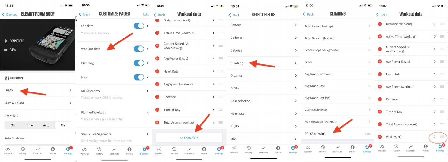 All devices have different set ups, but as an example, here’s how we set up VAM on our Wahoo Element Roam. This allows us to show it on our main page, and on our climbing page.