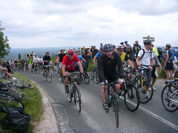 Over the half-way point of Turners Hill and on towards the looming South Downs and the sting in the tail of the L2B - Ditchling Beacon. The road to the top of the Beacon runs up the steep chalk scarp slope of the downs. Normally, it would be a hard but steady climb up the narrow road. But by this point weary legs and heavy cycles meant that many opted to walk. A margin on the right-hand side was left for those to ride up.