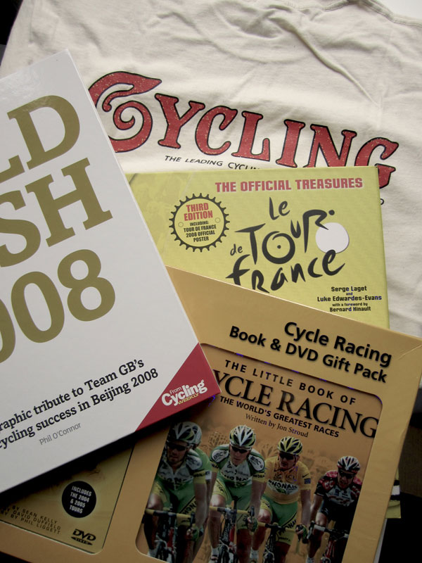 Our friends at Cycling Weekly have put together a bunch of top-quality material; The Official Treasures of the Tour de France by Serge Laget and Luke Edwardes-Evans is a handsome history of Le Tour including 40 items of fascinating memorabilia; Phil O'Connor's splendid photographic tribute to Team GB's medal haul at the Beijing Olympics, Gold Rush 2008; Le Tour de France official history DVD and Jon Stroud's Little Book of Cycle Racing; and a classic 1952 design Cycling T-shirt. Hours and hours of pleasure for any cycling fan.