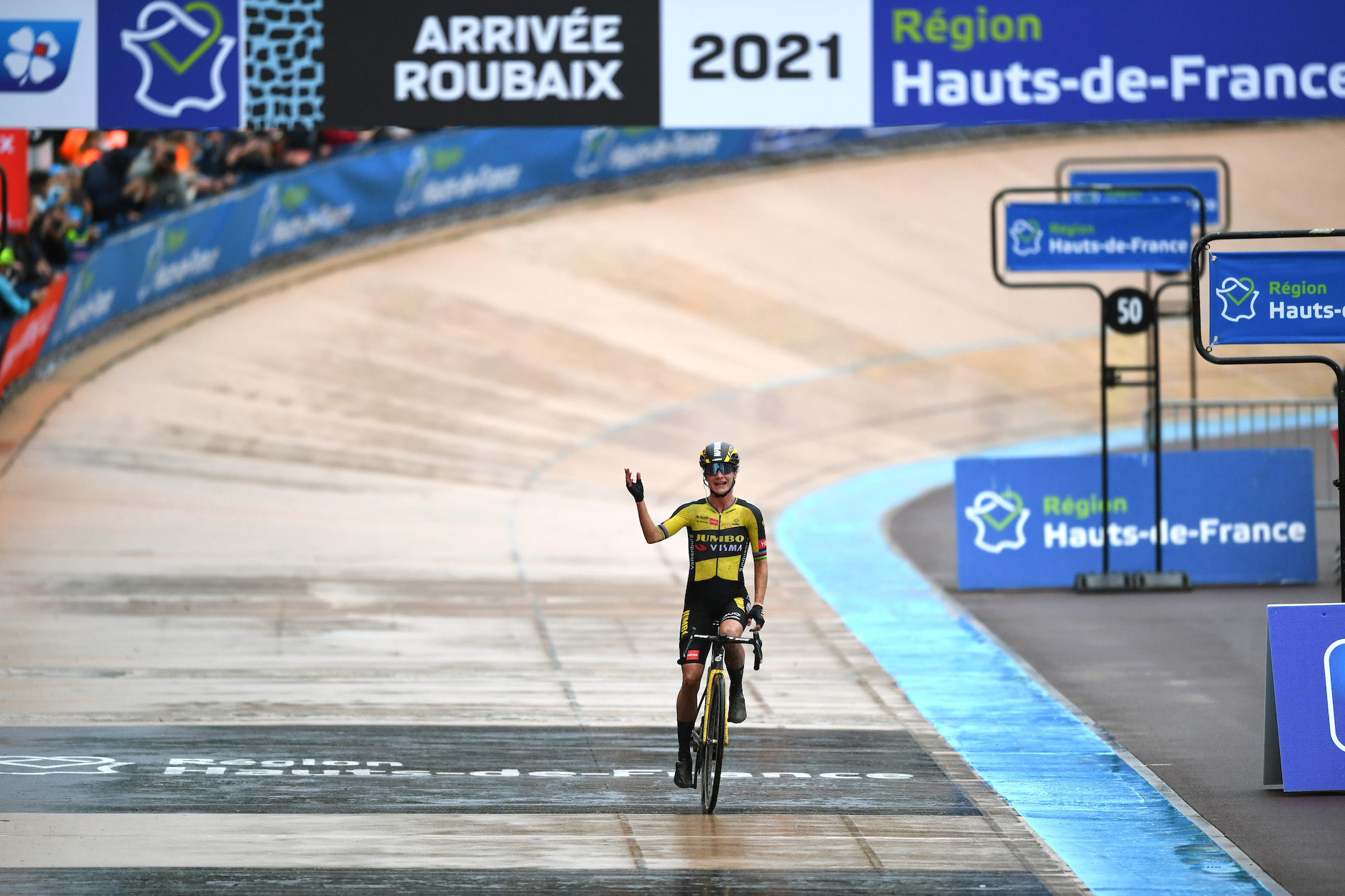 Van Dijk was among the riders to most visibly struggle with the cobbles, and, having had to make her way back up on the tarmac after being distanced on an earlier section, went down hard on Camphin-en-Pevele in the race’s most shocking moment. That she eventually got back on her bike showed just how much it means to finish a race and occasion as momentous as this.