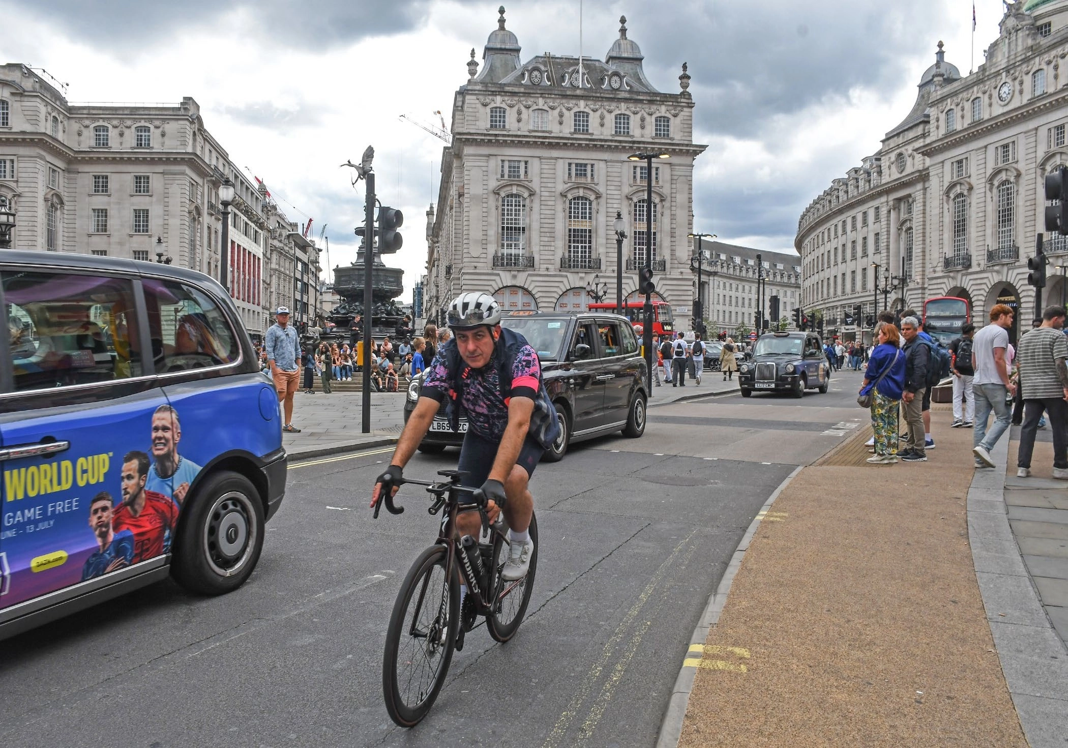 Several times we’re almost thwarted by roadworks and street closures, but finally, after venturing north to Camden and Islington to draw the V-shaped fingers, we loop back through Piccadilly Circus and Soho to finish at the Rapha clubhouse on Brewer Street, just in time to watch on TV Valentin Paret-Peintre edge out Ben Healy for a TdF stage win on Mont Ventoux.