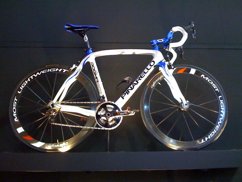 2010 Pinarello Dogma in a blue and white livery. It's the sort of bike that might be used by a pro team, but we just can't think of one with these colours. Yet. Ahem. Next...