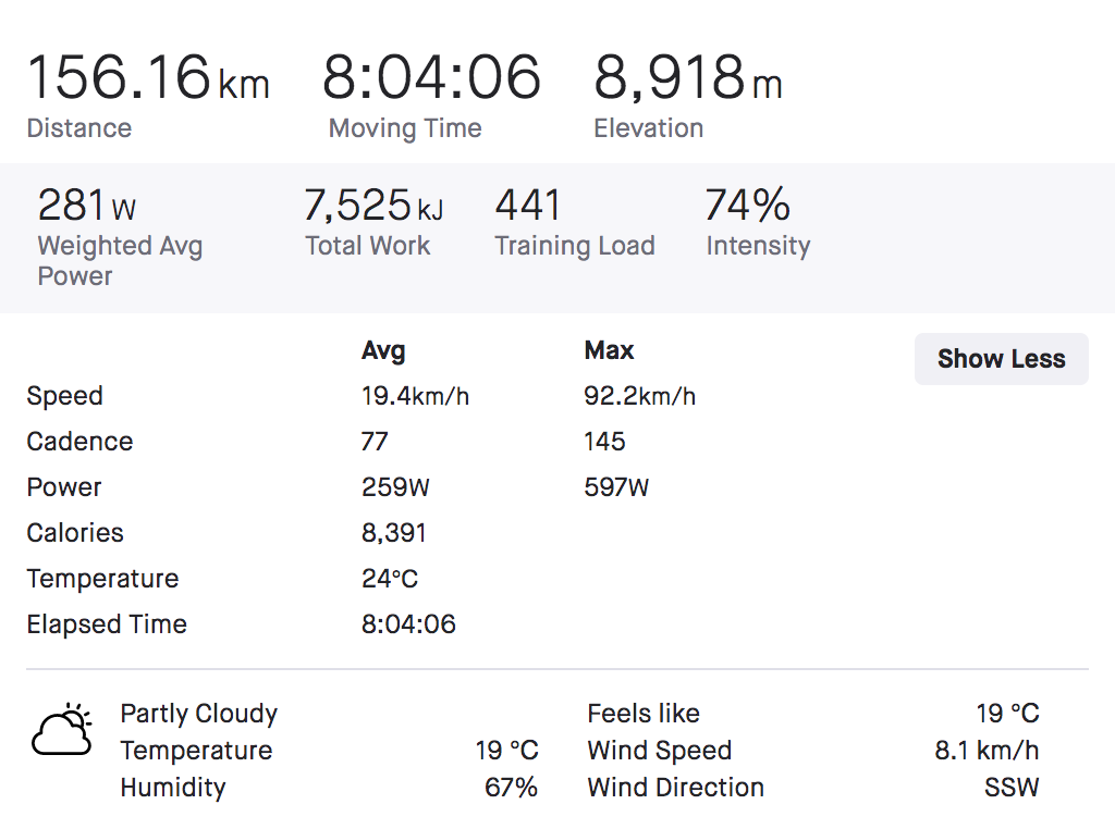 The 34-year-old burned more than 8,000 calories while ascending a total of 8,918m, and put out an average of 259W. He rode at an average speed of 19.4km/h and reached a maximum of 92.2km/h on the descents.