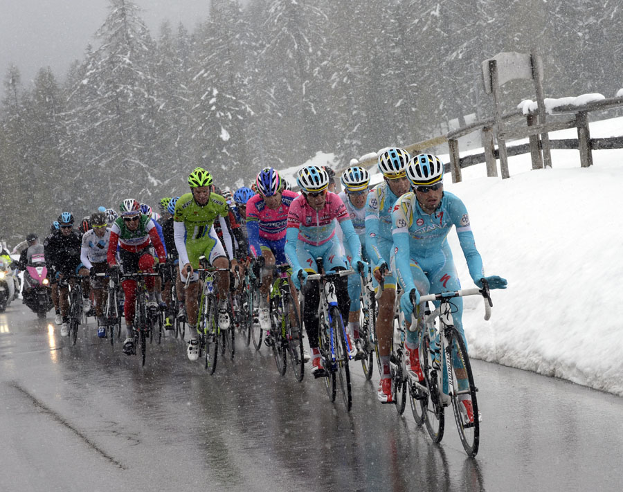 It climbs the Gavia, Stelvio and Zoncolan passes but 5,000 metres less than this year's edition. Vincenzo Nibali (Astana) won this May, a three-week race marked by bad weather. Snow caused two stages to be shortened and one to be cancelled. Pre-race favourites Bradley Wiggins (Sky) and Ryder Hesjedal (Garmin-Sharp), the defending champion, abandoned. When Nibali clinched his win, he did so under blizzard-like conditions on Tre Cime di Lavaredo.