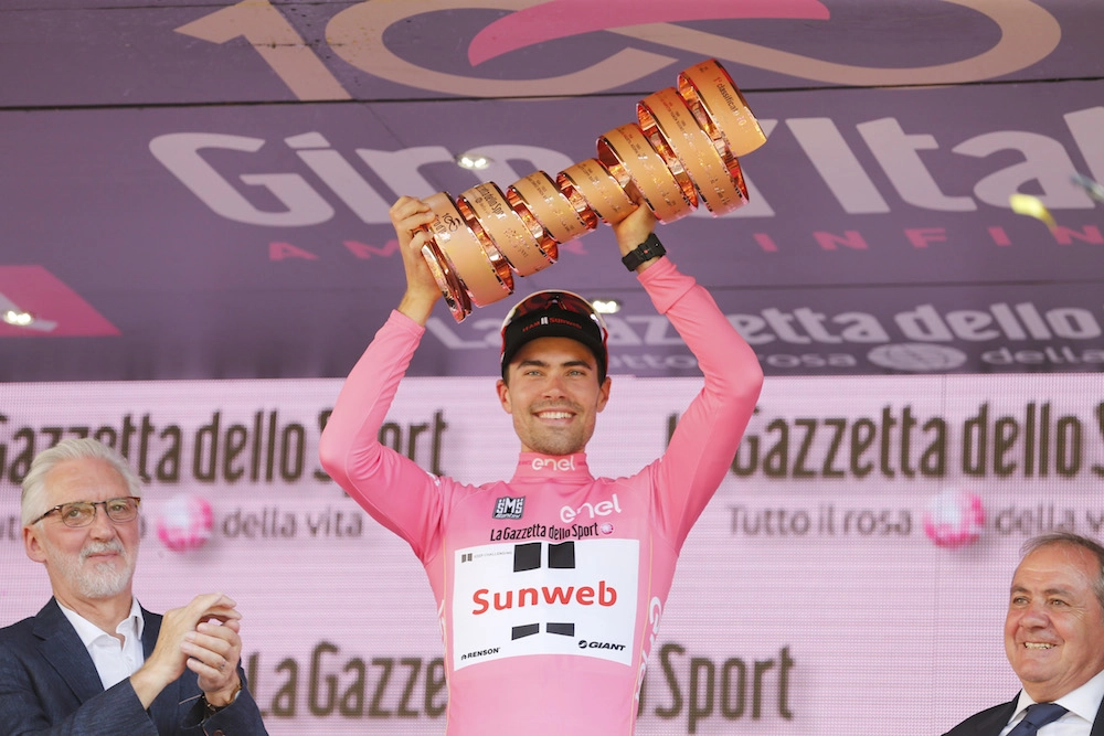 om Dumoulin celebrates after winning the 2017 Giro d'Italia.