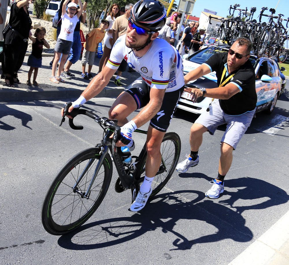 Cavendish, with a ripped British champion's jersey, re-entered the speeding peloton with 23 kilometres to race. Omega Pharma set up its train as it had yesterday to produce the win. Today, however, it failed in the final kilometres.