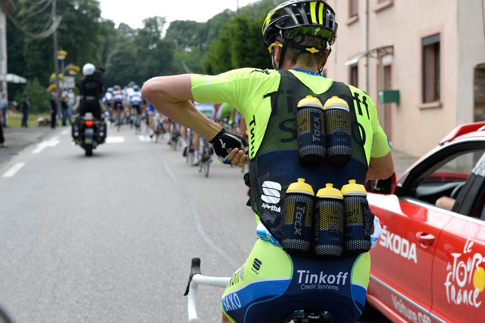 Used exclusively by Tinkoff-Saxo during the Tour, the vest can be loaded with bottles by a helper in the team car and then slipped over the shoulders of the willing domestique. Once the water carrier has ridden up to the peloton, team-mates can grab their bottles themselves.
