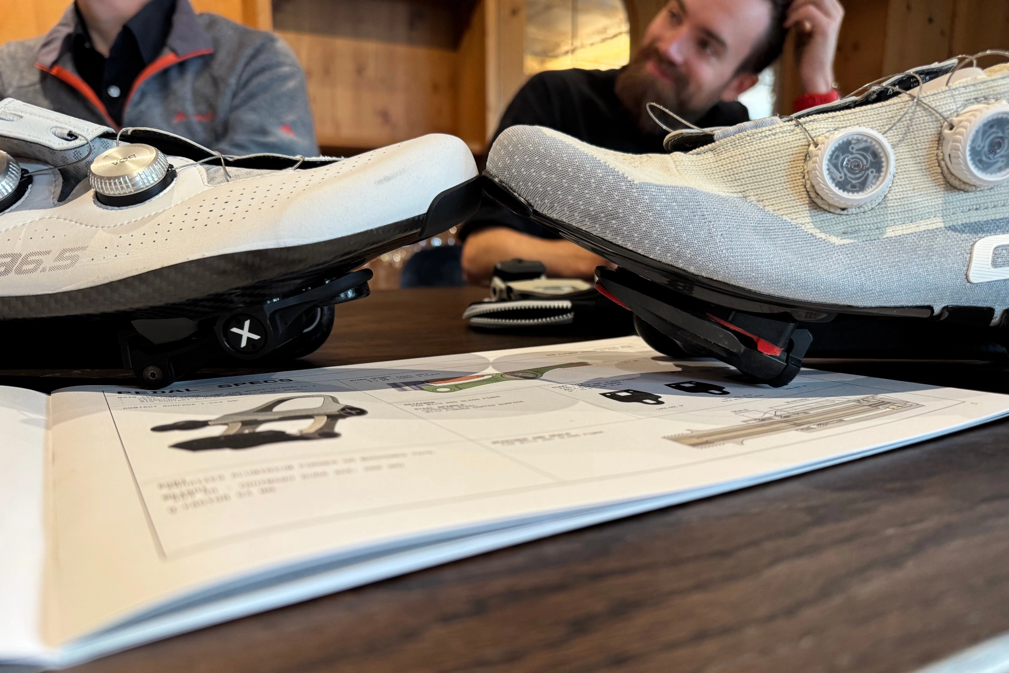 New to the market though is the Q36.5 x SRM pedal system, which we reported on earlier. This is a new clip-in pedal similar in engagement to 3-bolt systems, but the stack height has been dramatically decreased. This system uses a 2-bolt cleat fitting system, and everything has been slimmed down massively so that the pedal and cleat make up just 9.7mm of stack height from the pedal axle. Add to that the 4.4mm cleat mounting platform, and sole of the Q36.5 shoes and you have a total stack (without insole) of just 14.1mm, less than a full Dura-Ace pedal without the shoe.
