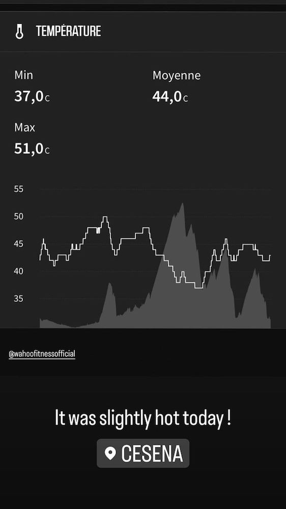 After finishing stage four into Cesena Canadian Magdeleine Vallieres Mill (EF Education-Tibco-SVB) posted a picture on her Instagram story showing a maximum temperature of 51º recorded by her bike computer during the stage, which was won by Annemiek van Vleuten (Movistar), and an average temperature of 44º.